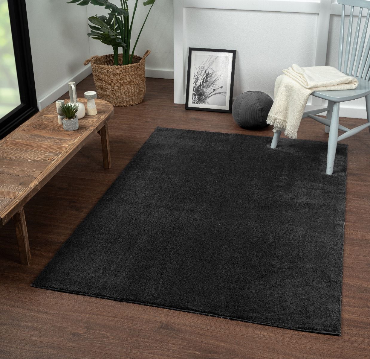 Et vanlig og vaskbart teppe i fargen svart. Teppet har en myk og behagelig tekstur som er veldig lett å ta vare på. Luven er tykk og tett, noe som gjør teppet både til en god lyddemper og et varmt sted for føttene å hvile på. Matten har en gummibakside som kan gjøre den mer stabil mot gulvet sammenlignet med andre matter. Dette teppet er OEKO-TEX-sertifisert.